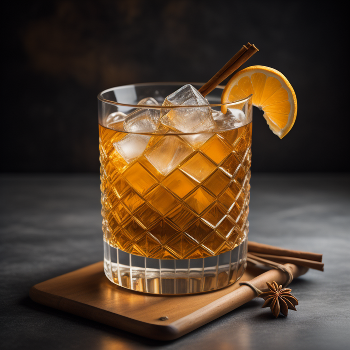 A warm and comforting cocktail with a reddish-brown hue, garnished with a cinnamon stick and star anise.
